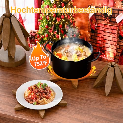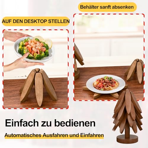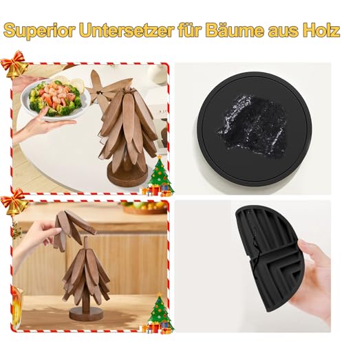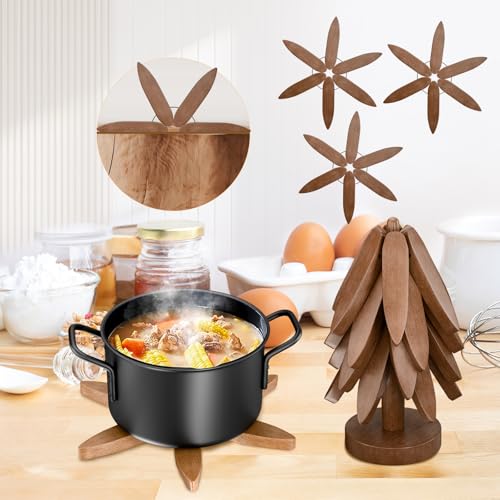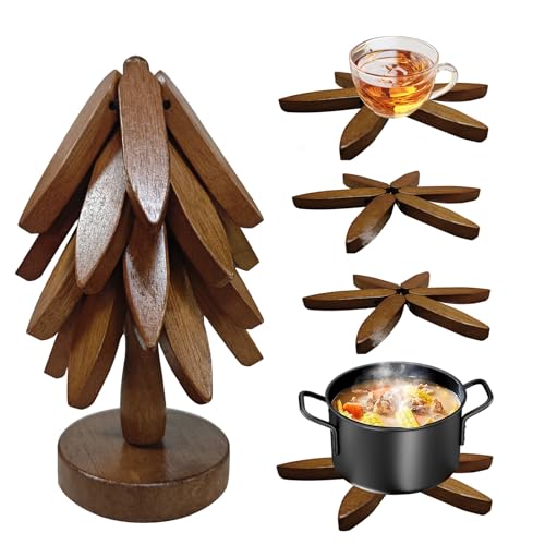 congumi - قواعد اكواب خشبية للاطباق الساخنة، مجموعة قواعد اكواب خشبية على شكل شجرة مكونة من 4 قواعد اكواب خشبية + حامل واحد، قواعد اكواب قابلة للطي ومقاومة للحرارة لابريق الشاي والمقالي والوعاء من كونجومي