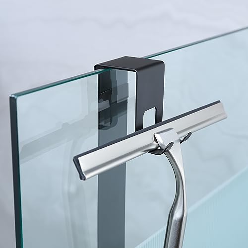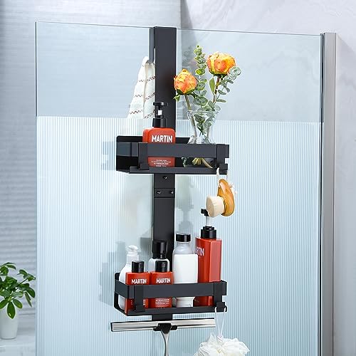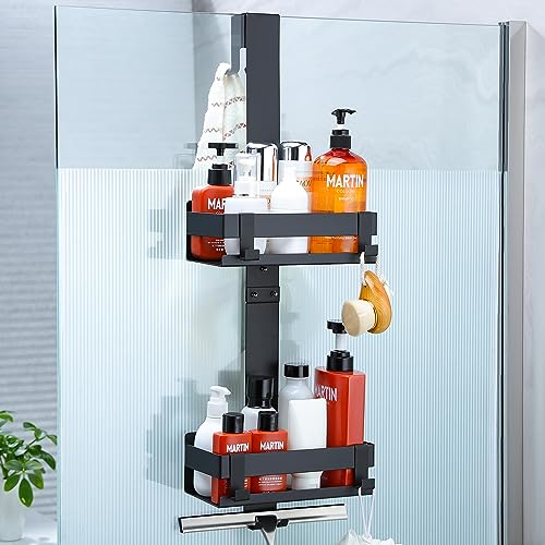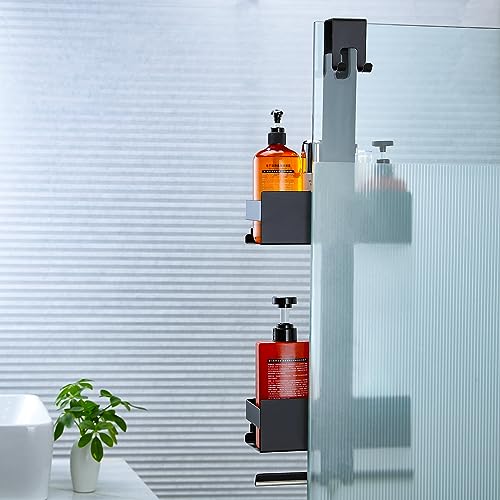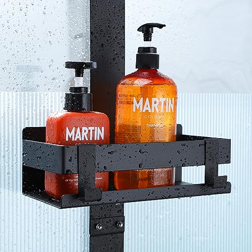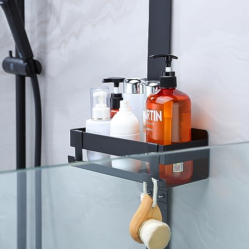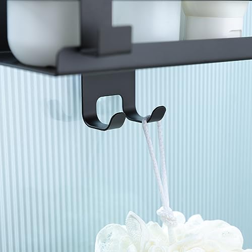 Cooeco - رف دش بدون ثقب بلون اسود من كويكو - حامل دش للشامبو للتعليق في الستانلس ستيل، حامل صابون للاستحمام والحمام مع 4 خطافات للباب الزجاجي حتى 35 ملم