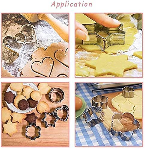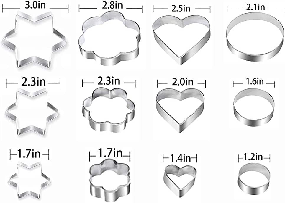 - 12 شكل قاطع مختلف، حجم صغير - شكل الزهرة: 2.8 بوصة، 2.4 بوصة، 2 بوصة؛ شكل النجمة: 3.1 بوصة، 2.4 بوصة، 1.8 بوصة؛ شكل القلب: 2.2 بوصة، 1.4 بوصة، 1.3 بوصة؛ شكل دائري: 2.1 بوصة، 1.6 بوصة، 1.2 بوصة. الارتفاع: شكل الزهرة: 1.5 سم ، شكل دائري: 1.5 سم ، شكل النجوم: 1.5 سم ، شكل دائري: 1.8 سم