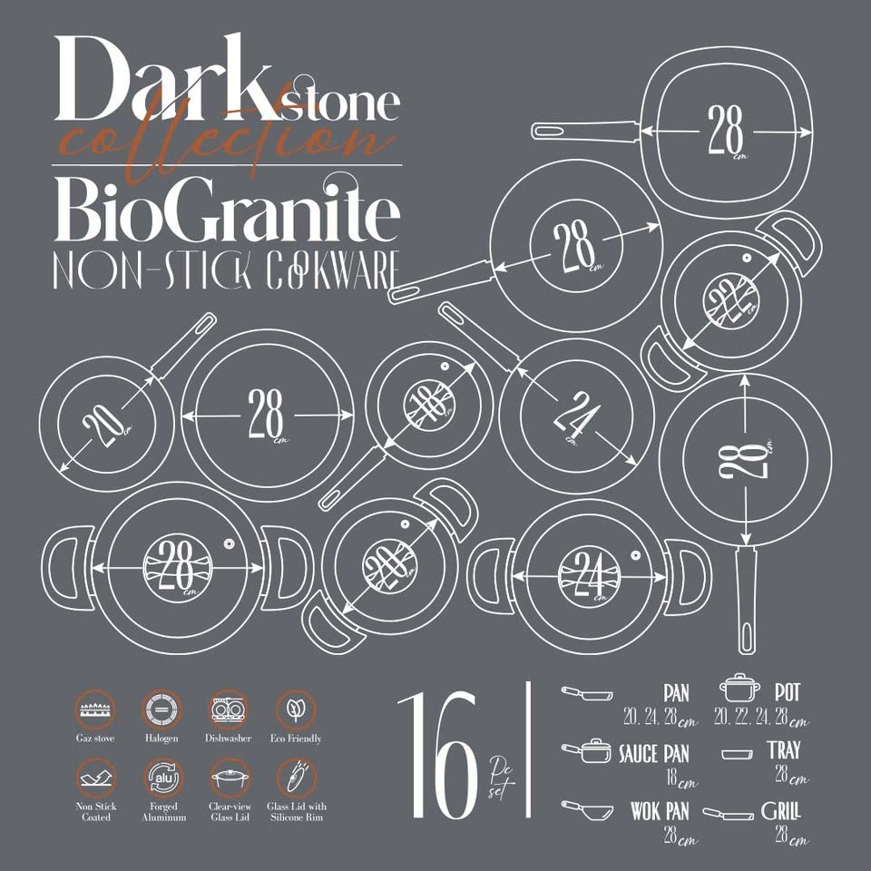 Cookin Aboud - طقم من 16 قطعة مكون حلي طهي الجرانيت الحيوي مقاس + كسرولة 18 سم طاسات قلي طاسة ووك 28 شواية صينية فرن أسود كوكين عبود
