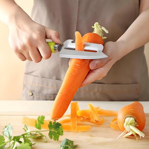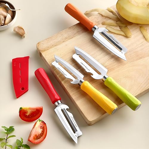 - مجموعة من أربعة سكاكين تقشير متعددة الاستخدامات بمقابض ألوان عشوائية، مما يسمح بسهولة التعرف والاستخدام الصحي للأطعمة المختلفة.