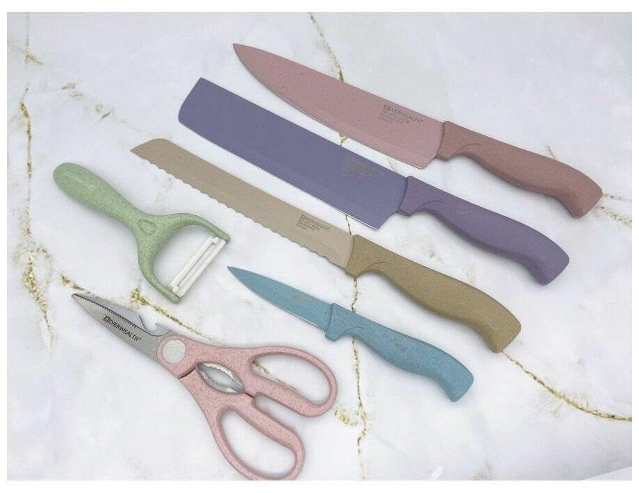 - تتضمن مجموعة سكاكين المطبخ المسننة المصنوعة من الستانلس ستيل المكونة من 6 قطع سكين شيف وسكين خبز وسكين تقشير ومقشرة ومقص وسكين سيراميك. يغطي المزيج كل مهمة أساسية من التقطيع إلى التقشير، مما يجعله متعدد الاستخدامات وعملي للطهي وتناول الطعام.
