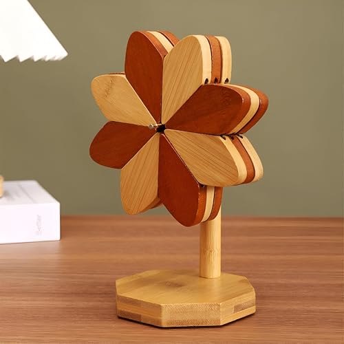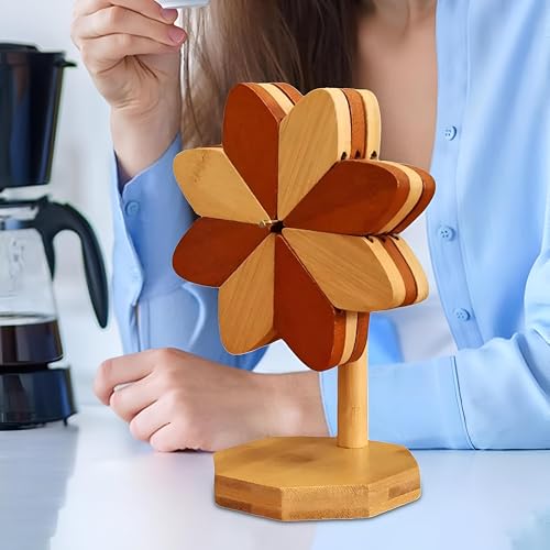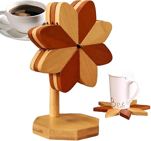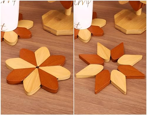 - تتميز مجموعة قواعد الأكواب الخشبية هذه بتصميم فريد يشبه الزهرة، مثبتة بشكل إبداعي على حامل على شكل شجرة، مما يجعلها إضافة لافتة للنظر لأي إعداد طاولة مع توفير الاستخدام العملي للأطباق الساخنة والمشروبات.