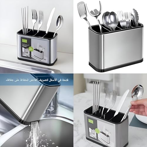 - مصفاة أدوات تناول الطعام من الفولاذ المقاوم للصدأ لحوض المطبخ بسلة للتجفيف، منظم وحامل تخزين لأدوات تناول الطعام لطاولة الطعام والمعالق والشوك وعيدان الطعام