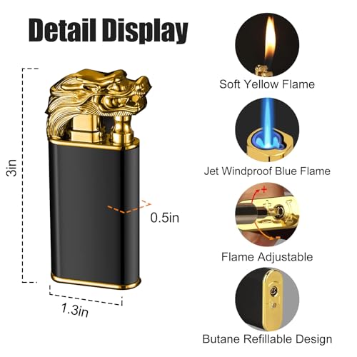- [تصميم مبتكر] ولاعة اللهب المزدوجة الرائعة هذه أنيقة وفريدة للغاية. ينتج عن الضغط على الزر شعلة مقاومة للرياح، بينما ينتج عن تحرير الزر لهبًا ناعمًا، وهو مبتكر وممتع للغاية. ولاعة الشعلة الرائعة مصنوعة بتقنية متقدمة وحرفية رائعة، مع ملمس قوي لتجربة استخدام مثالية، مما يجعلها لا تقاوم. التصميم الإبداعي مثير للإعجاب. (ملاحظة: البوتان غير متضمن بسبب تنظيم البريد الجوي.)