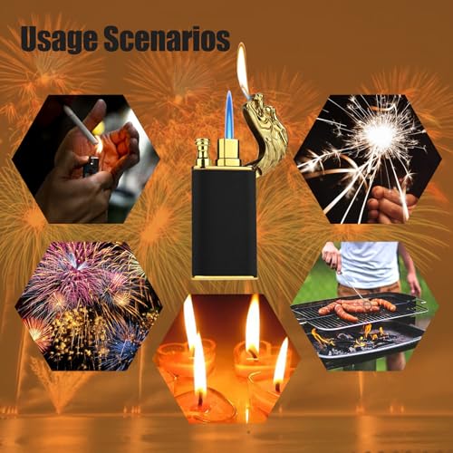 - [هيكل معدني كامل ومضاد للتسرب] تأتي مع حماية أمان من ثلاث طبقات، الولاعة مصنوعة من خليط معدني من الزنك عالي الجودة ومعبأة في عبوة صندوق هدايا. يمكن أن تضيء في ظروف الرياح، ومناسبة للأنشطة الخارجية مثل التخييم والمطبخ والشواء وما إلى ذلك.