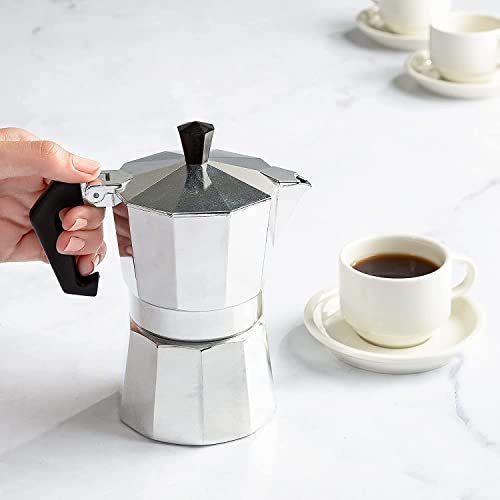 - 【سهلة ويمكن الاعتماد عليها】: يمكن استخدامها على موقد الغاز أو السيراميك، مما يسمح لك بعمل بأفضل مذاق للقهوة والاستمتاع به بكل سهولة. يضمن التصميم الإيطالي الكلاسيكي توزيعًا متساويًا للحرارة من أجل مذاق قهوة رائع وذو رائحة. سعة الإبريق 3 أكواب إسبريسو الأوروبية بسعة 2 اونصة أو 1 كوب 5 اونصة أكواب بنمط أمريكي.