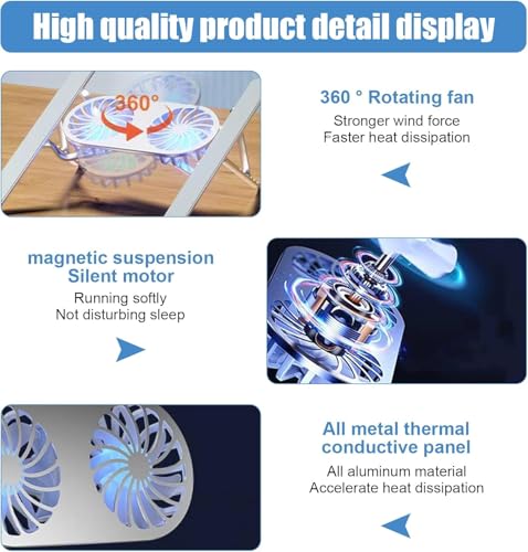 - 【قوي وواقي】حامل بساط تبريد اللاب توب هذا مصنوع من خليط معدني من الألومنيوم، سهل التنظيف ومقاوم للخدش والصدأ مع 4 وسادات سيليكون غير قابلة للانزلاق في الأسفل. مع مراوح مزدوجة، تبديد حرارة أسرع وإضاءة LED زرقاء. 【مروحة تبريد فائقة ومنفذ USB】يأتي حامل وسادة تبريد اللاب توب هذا مع مروحتين صامتتين عالية الطاقة، تبريد ديناميكي 360 درجة. مروحة التبريد هادئة للغاية، لذلك يمكنك العمل دون إزعاج تمامًا. مبرد لاب توب مع منفذ USB واحد، يمكنه تشغيل وسادة التبريد باستمرار.