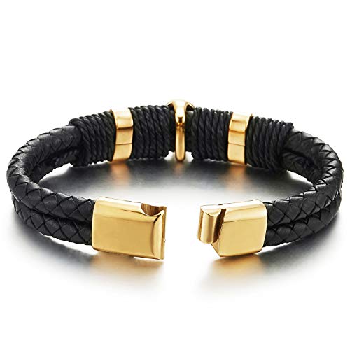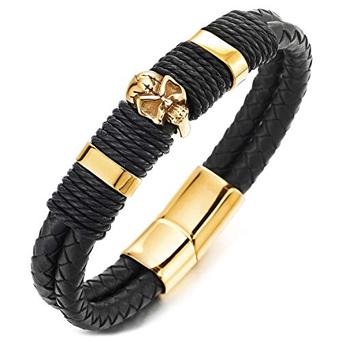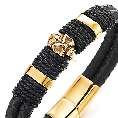 COOLSTEELANDBEYOND - سوار جلد مضفر اسود ذي صفين بجمجمة صلب مطلية ذهبي للرجال من كول ستيل اند بيوند، سوار ذو مشبك مغناطيسي, جلد, غير قابل للتطبيق