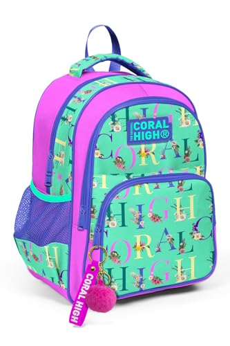Yaygan - شنطة ظهر مدرسية للاطفال من كورال هاي بلون اخضر اكوا وزهري فاتح ونمط مونوغرام بثلاثة اقسام