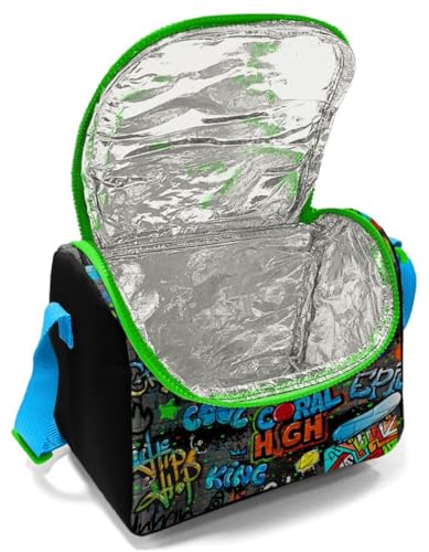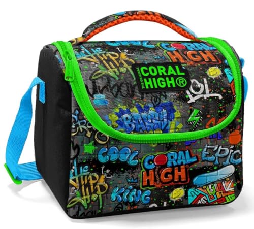 Coral High - حقيبة غداء حرارية للاطفال من كورال هاي - اسود وازرق بنمط جرافيتي, متعدد الألوان، البوليستر