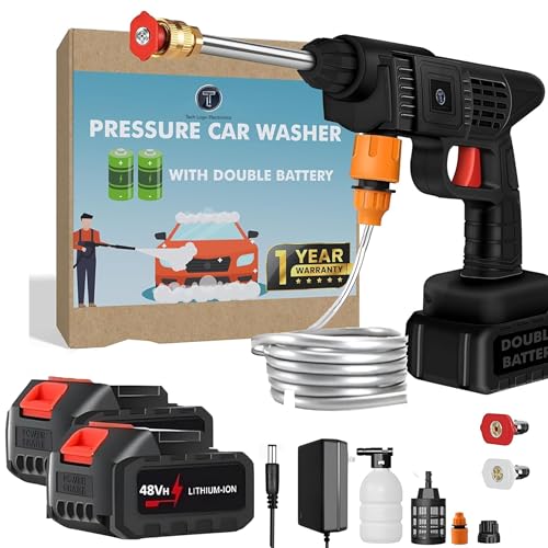 TECH LOGO ELECTRONICS - مسدس غسيل لاسلكي محمول يعمل بالضغط بجهد 48 فولت وسعة 12000 مللي امبير في الساعة لغسيل السيارات والدراجة والتنظيف متعدد الاغراض بفوهة قابلة للتعديل وانبوب خرطوم بطول 5 متر (بطارية مزدوجة)