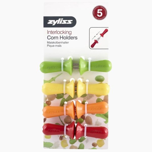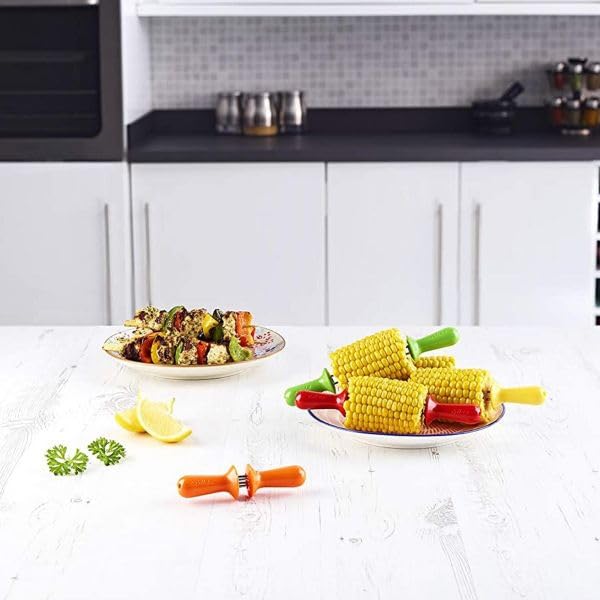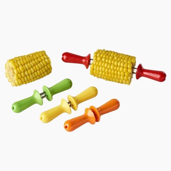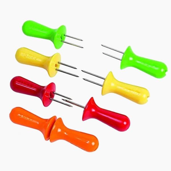 - التصميم: مجموعة حوامل ذرة مريحة تتميز بـ 4 أزواج من الحوامل ذات الشقين مع مقابض بلاستيكية مريحة بألوان متعددة نابضة بالحياة.