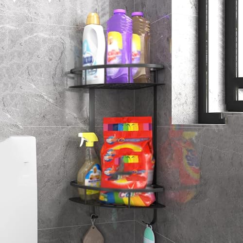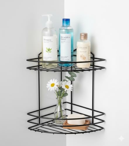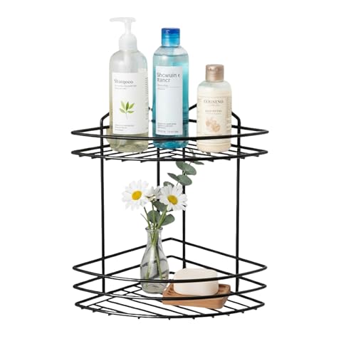 Happy Home - حامل دش للزوايا مكون من طبقتين، منظم سلة دش بلون أسود من الفولاذ المقاوم للصدأ، رفوف تخزين لزاوية الحمام