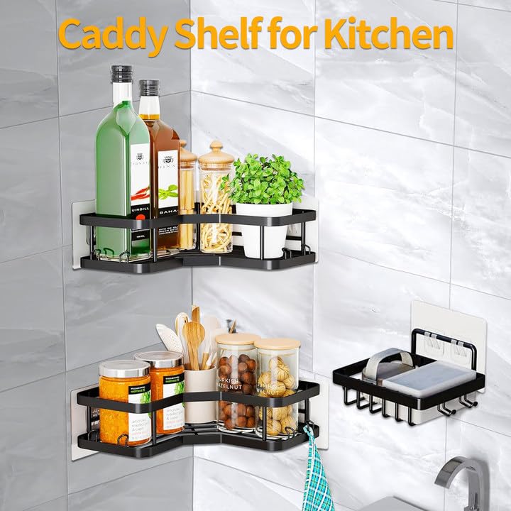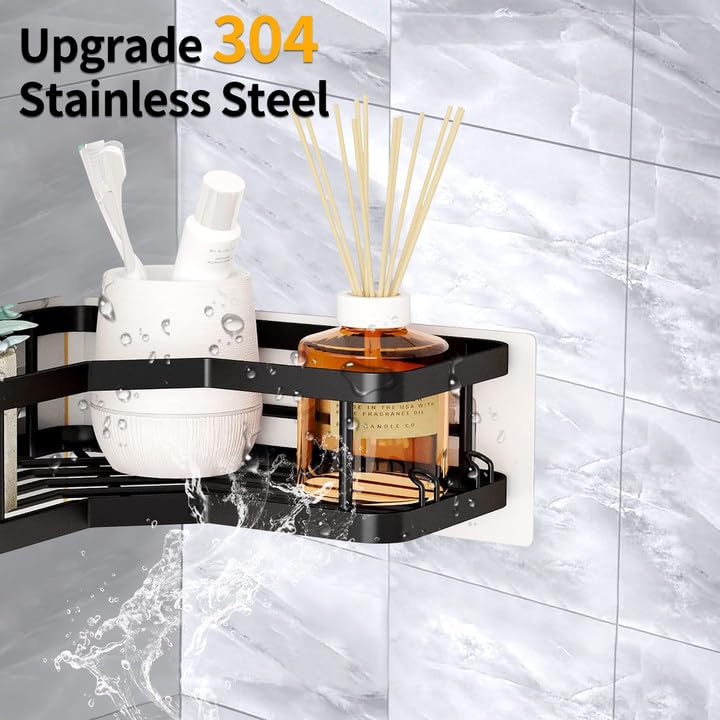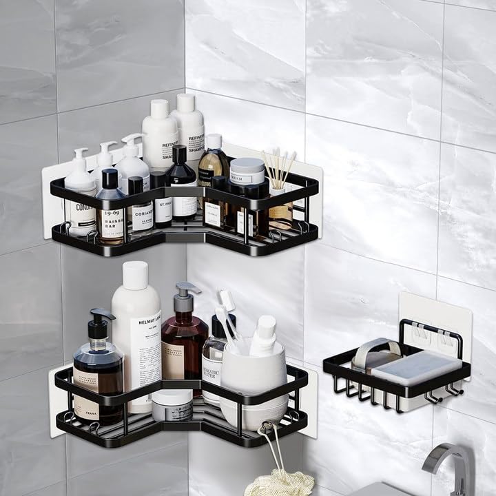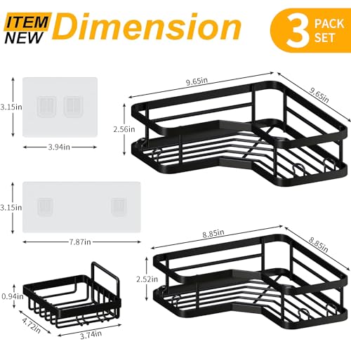 ZHOHO TANT - رف زاوية للحمام، بتصميم عصري، باللون الأسود، مصنوع من الستانلس ستيل، موفر للمساحة مع تثبيت لاصق وقابل للإزالة، مجموعة من 3 قطع