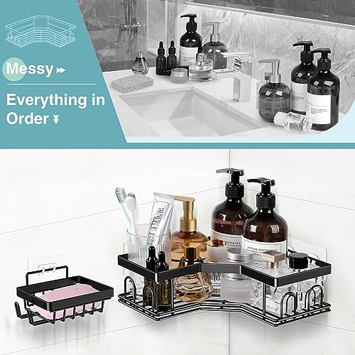 Jadkysarh - منظم أدوات الاستحمام من جادكيساره، رف دش ذاتي اللصق مع خطافات، حامل صابون بدون ثقب، منظم دش من الفولاذ المقاوم للصدأ، حامل فرشاة الأسنان، اكسسوارات ديكور الحمام، لون أسود، 5 قطع