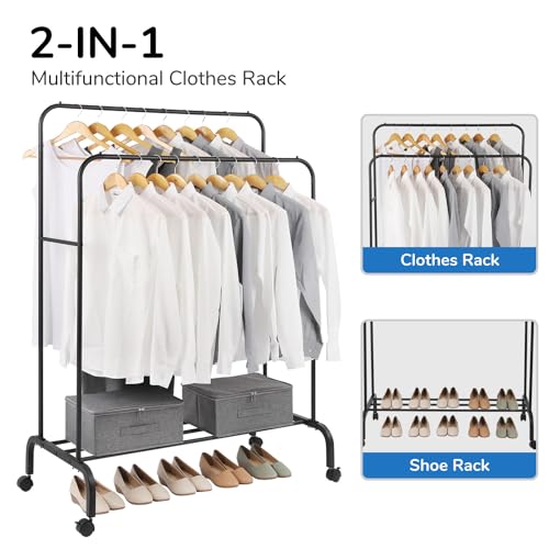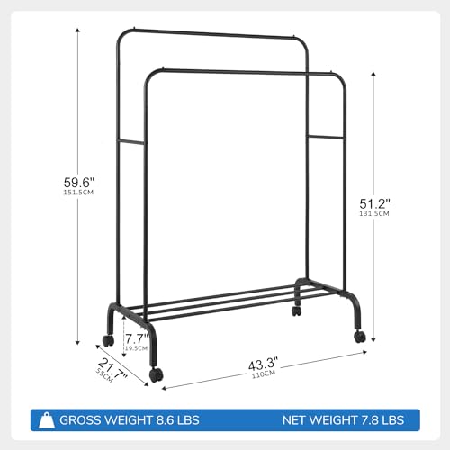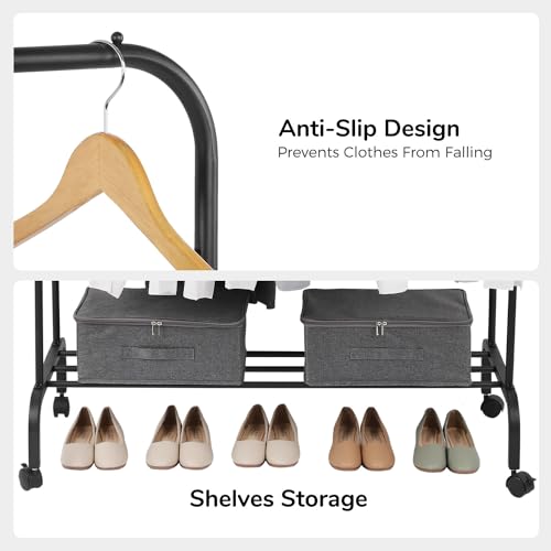 COSLD - رف ملابس بعجلات من كوسلد، رف ملابس بقضيبين لتعليق الملابس، مع أرفف منظم للتخزين، إطار معدني بلون أسود، لغرفة النوم والمكتب والمتجر