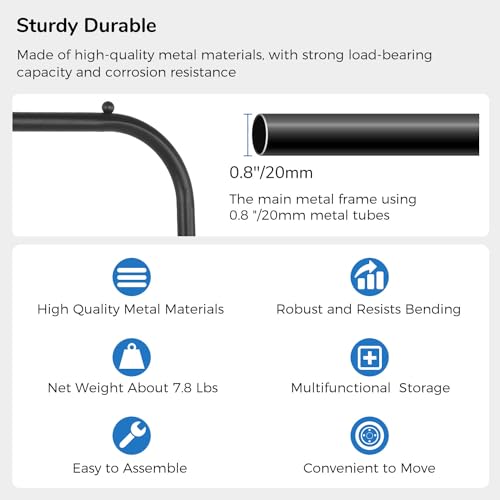 - [قوي ومتين] رف الملابس مصنوع من أنابيب معدنية عالية الجودة ومتينة مع قدرة تحمل جيدة. قضيب التعليق قوي وليس من السهل كسره.