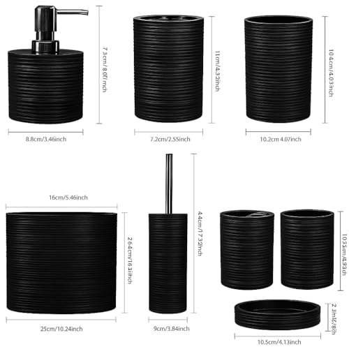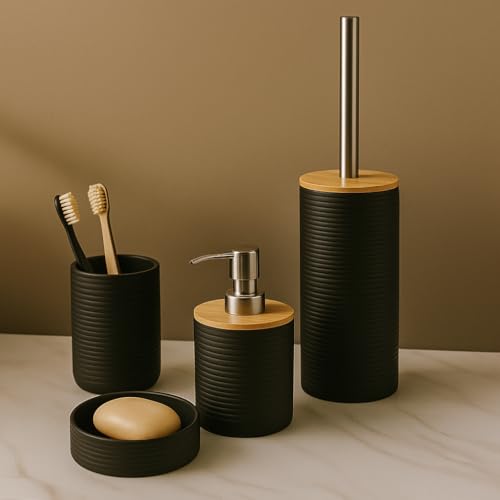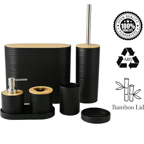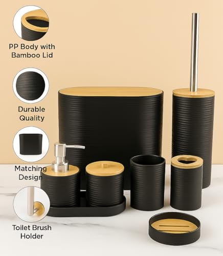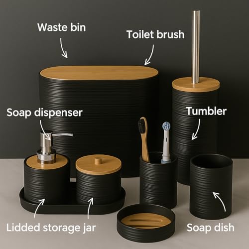 Coslife - مجموعة اكسسوارات الحمام مكونة من 8 قطع من كوزلايف ستور مع اغطية من الخيزران - تتضمن موزع صابون وحامل فرشاة اسنان وكوب وطبق صابون وسلة وفرشاة - تصميم عصري مضلع (اسود)