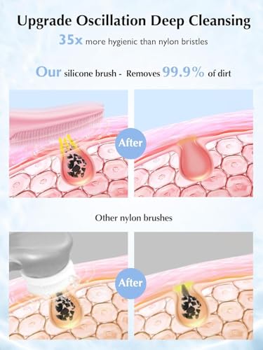 - تنظيف عميق وتقشير لطيف: بالمقارنة مع فرش الوجه المستديرة الأخرى الموجودة في السوق، تحتوي فرشاة الوجه الخاصة بنا على شعيرات سيليكون ناعمة سميكة في الجزء العلوي، والتي يمكنها بسهولة تنظيف المناطق الخاصة مثل جوانب الأنف ومنطقة T. رأس فرشاة فائقة النعومة بمساحة كبيرة، مناسبة للتنظيف اليومي للمناطق الكبيرة. في 3 دقائق فقط، يمكنك الحصول على بشرة أكثر صحة وإشراقاً، مع نتائج أفضل بنسبة 600% من غسل وجهك بيديك