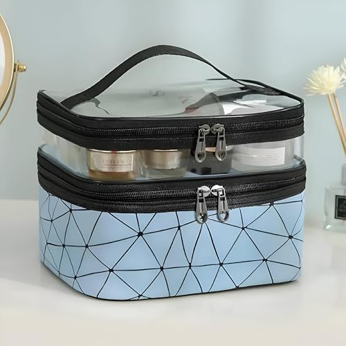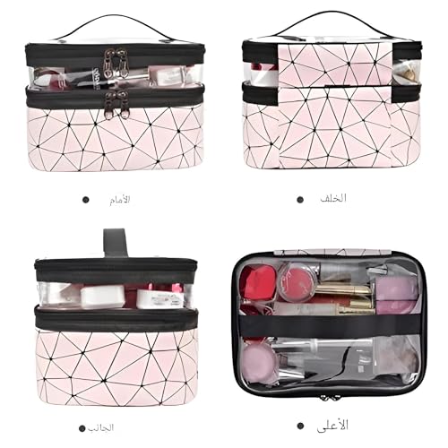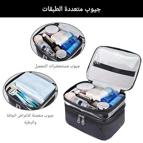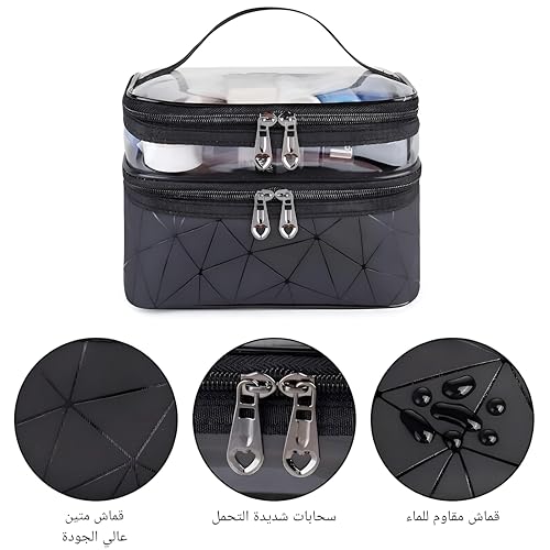 - توفر حقيبة المكياج مزدوجة الطبقات هذه طريقة مريحة ومنظمة لتخزين مستحضرات التجميل ومستلزمات التجميل، مع جيب بلاستيكي شفاف في الطبقة العلوية لسهولة الرؤية. يضمن نسيجها المقاوم للماء الحماية من الانسكابات، مما يجعله مثاليًا للسفر.