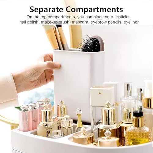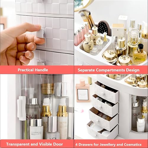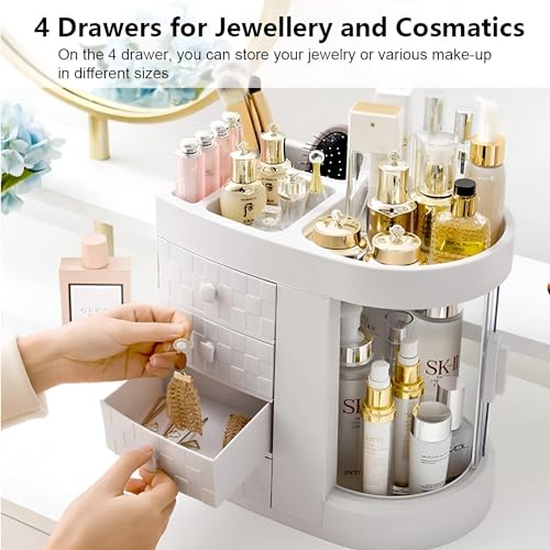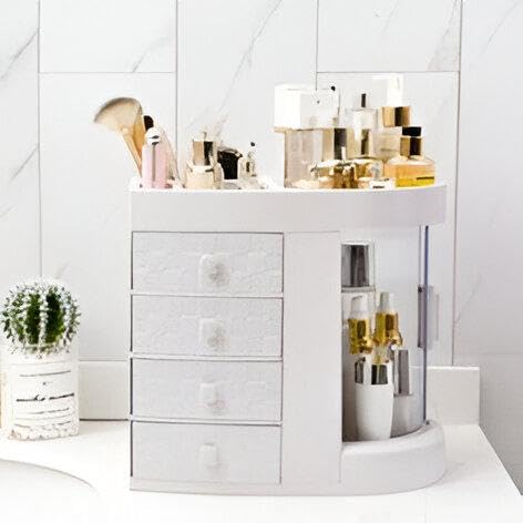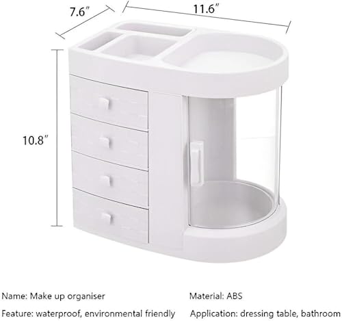 - مصمم بسعة عالية، الجزء العلوي يحمل بأمان أحمر الشفاه وطلاء الأظافر والفرش والماسكارا وأقلام الحواجب، بينما تستوعب الأدراج الأربعة أحجامًا مختلفة من المجوهرات أو منتجات المكياج، مما يحسِّن من مساحة التخزين.