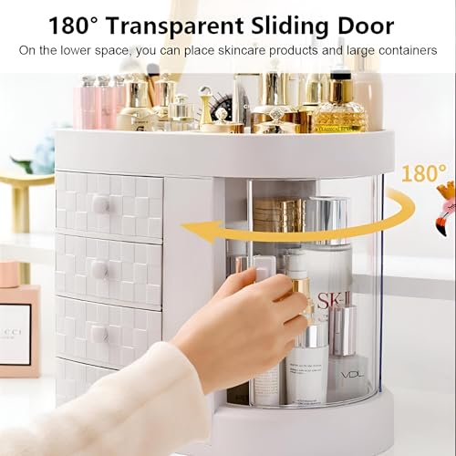 - يتميز منظم المكياج الشفاف هذا بأربعة أدراج واسعة وباب شفاف منزلق يفتح بزاوية 180 درجة، مما يوفر رؤية واضحة وسهولة الوصول إلى مستحضرات التجميل والمجوهرات والاكسسوارات في وحدة واحدة أنيقة.