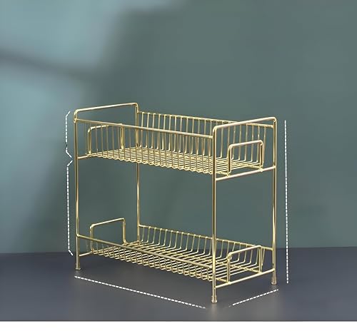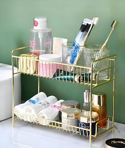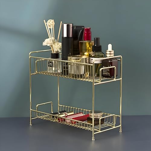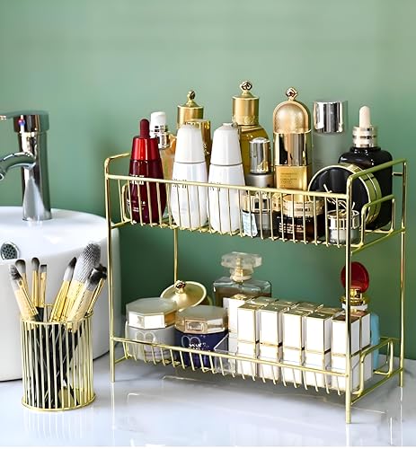 - منظم متعدد المستويات بإطار معدني أنيق مصمم لتوسيع مساحة السطح واستيعاب المكياج والعطور ومنتجات العناية بالبشرة، بمقاس 30 × 26.5 سم.
