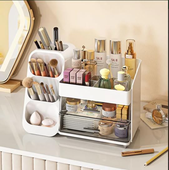 Generic - منظم تخزين مستحضرات التجميل مع حامل فرش المكياج، صينية فانيتي من طبقتين، ابيض