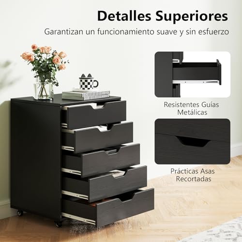 COSTWAY - خزانة أدراج بـ 5 أدراج من كوستواي، درج مكتب مع عجلات، خزانة ملفات مكتبية متنقلة، 50 × 42 × 67 سم، (لون أسود)