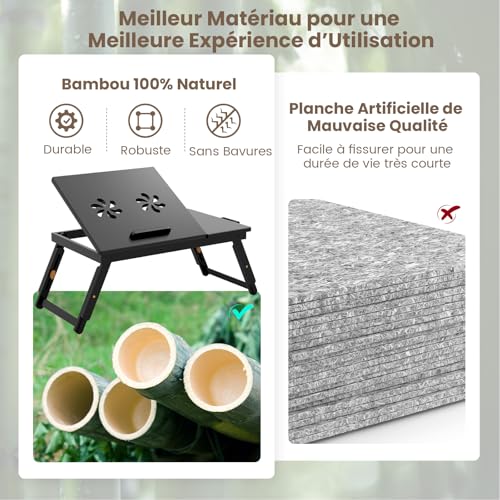 COSTWAY - طاولة سرير قابلة للطي، صينية سرير من البامبو بأرجل قابلة للتعديل وصينية إمالة، حامل لاب توب بدرج وفتحات للتهوية من كوستواي، مقاس 53 × 33 سم، لون بني