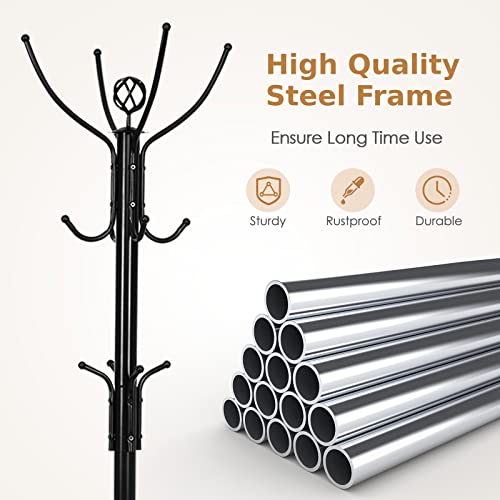 COSTWAY - كوستواي حامل معاطف معدني قائم بذاته مكون من 12 خطاف لتعليق القبعات والملابس في المنزل والمكتب وغرفة النوم والمدخل والقاعة 190 سم-200 سم اسود مع قاعدة 4 ارجل خليط صلب