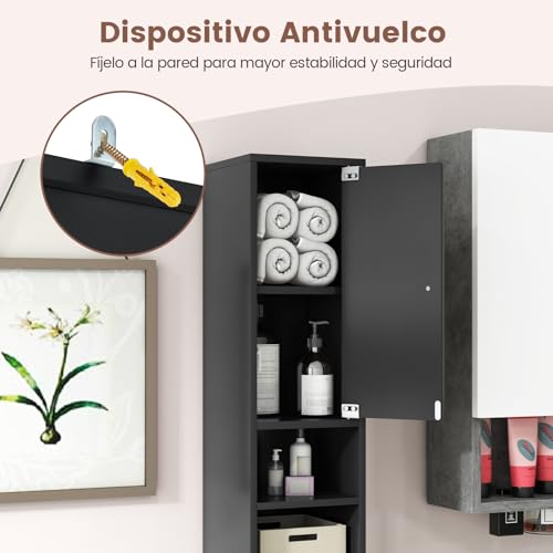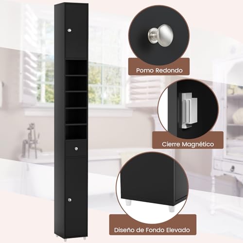 COSTWAY - خزانة حمام طويلة عمودية ورفيعة مع بابين بدرج واحد و5 أرفف قابلة للتعديل من كوستواي - مقاس 20 × 180 سم - لون أسود معدن