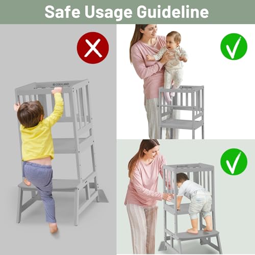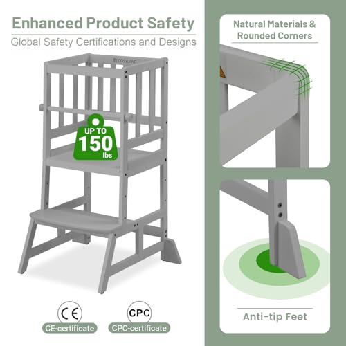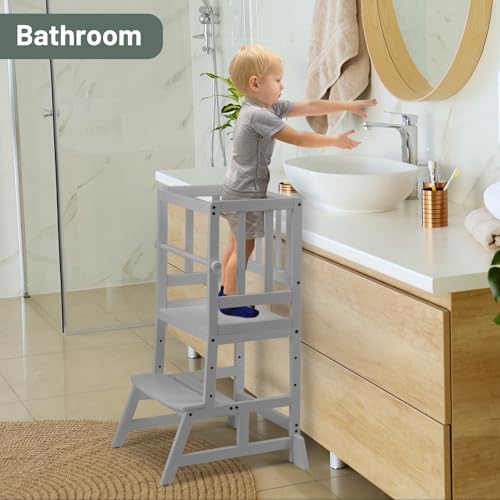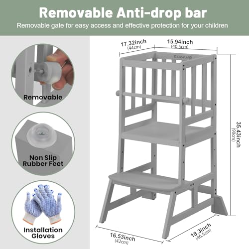 COSYLAND - كوزد لاند مقعد مطبخ قائم بارتفاع قابل للتعديل للاطفال الصغار - مقعد تعلم للاطفال، حامل مساعد للمطبخ والحضانة مع قضيب امان من الخيزران الطبيعي، قوي وخفيف الوزن، رمادي