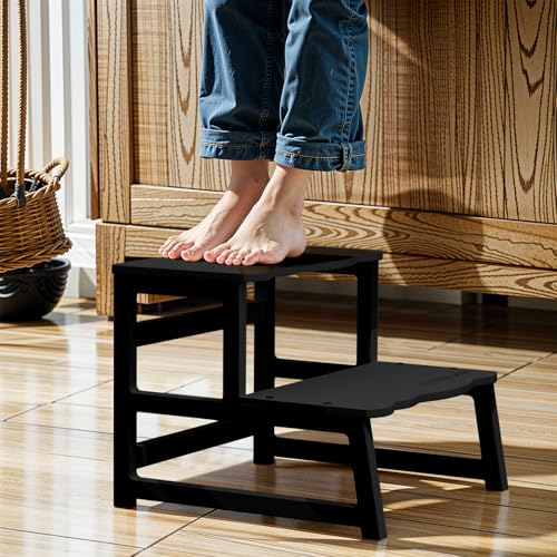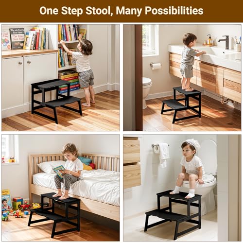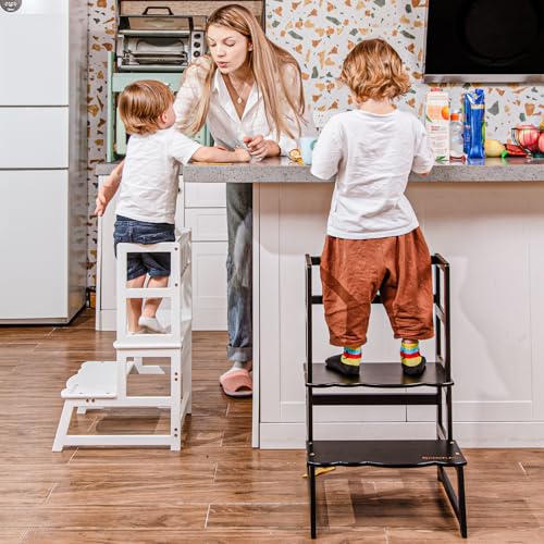 COSYLAND - كرسي مطبخ صغير للأطفال الصغار من كوزي لاند، برج قائم متعدد الوظائف قابل للتحويل إلى كرسي بدرجتين، كرسي خشبي مساعد للمطبخ، لون أسود