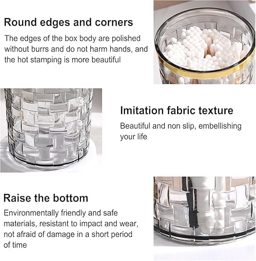 - المادة ---- موزعات حامل أعواد القطن للكرات القطنية مصنوعة من البلاستيك السميك مع حافة ناعمة آمنة وصلبة ومقاومة للكسر. بفضل النفاذية العالية، يمكن رؤية المحتويات في لمح البصر.