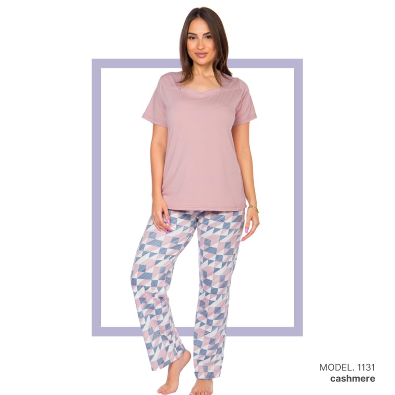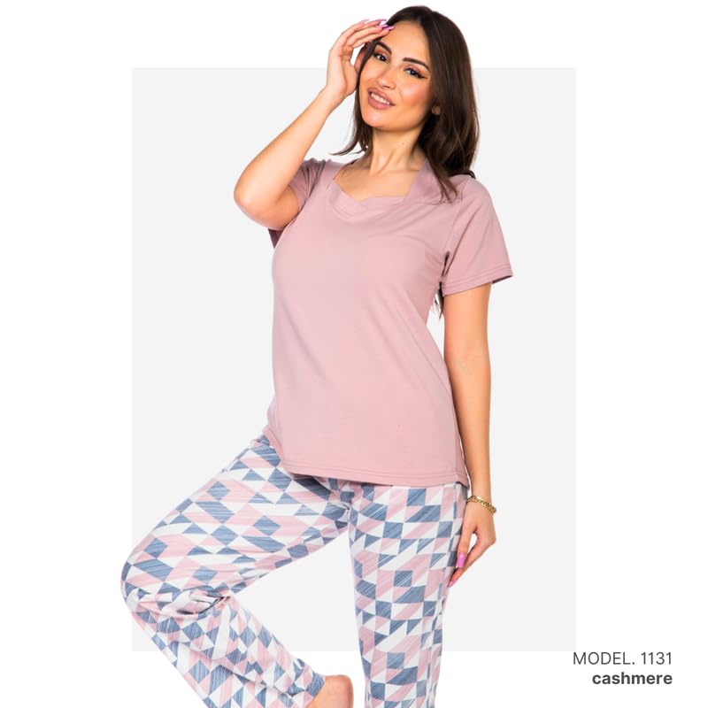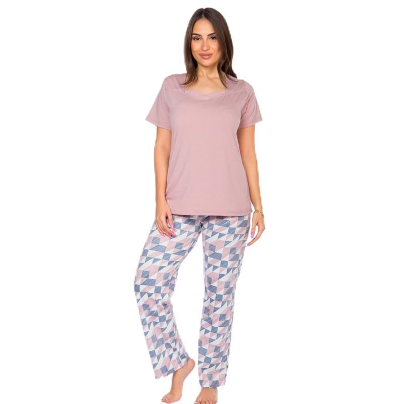 Cotton Zone - كوتون زون طقم ملابس منزلية للنساء - بنطلون ناعم وقميص قصير الاكمام - PL1131