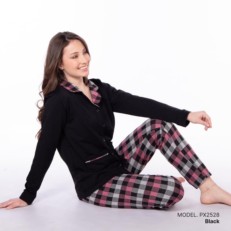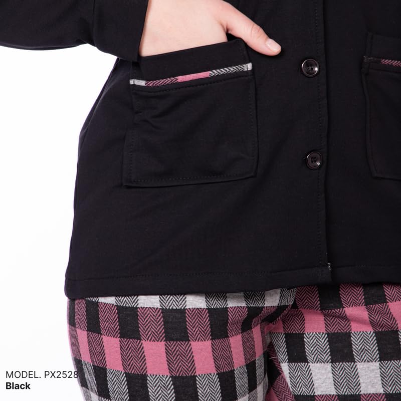 Cotton Zone - طقم بيجامة للنساء مكونة من بلوزة بأكمام طويلة بأزرار مع بنطلون بنمط هايدي من كوتون زون، (طقم من قطعتين)، PX2528