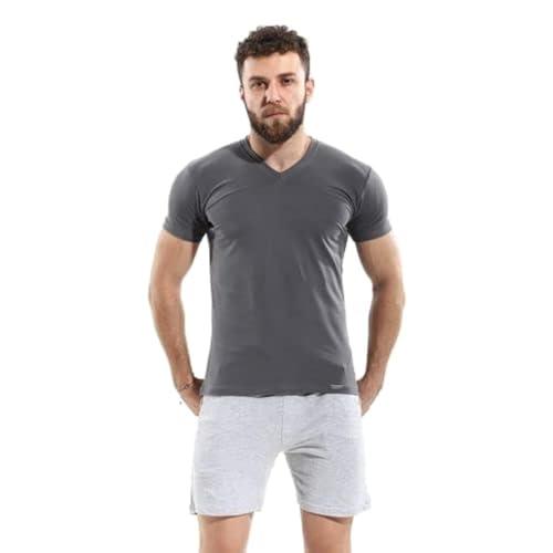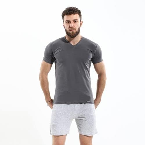 Cottonil - تيشرت بيسيك بلون رمادي غامق سادة برقبة شكل V للاولاد من كوتونيل، مقاس 3، S