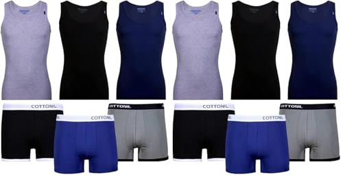 Cottonil - طقم مكون من 3 بوكسرات سادة و3 تيشيرت ديربي بدون اكمام من قطونيل، متعدد الالوان مقاس، مزيج القطن