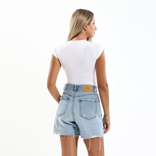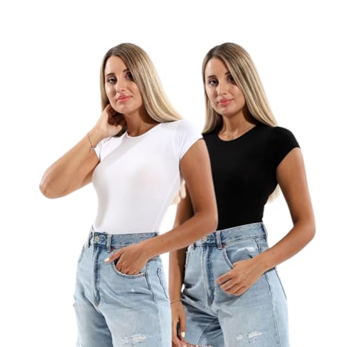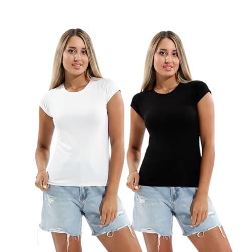 Cottonil - قطونيل توب بيسيك من القطن للنساء برقبة دائرية واكمام قصيرة، بلوزة كاجوال بقصة ضيقة، عبوة من قطعتين، اسود وابيض