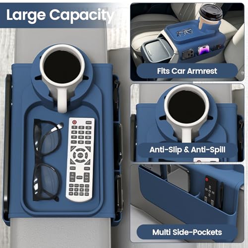 PANZIYU - صينية مسند ذراع الكنبة من السيليكون بحامل أكواب مضاد للانسكابات والانزلاق للمشروبات مع جيوب داخلية منظمة لتخزين أجهزة التحكم عن بعد والموبايل والتابلت والوجبات الخفيفة، أزرق