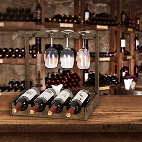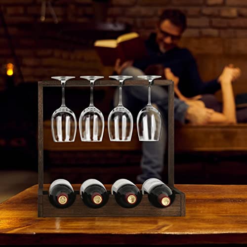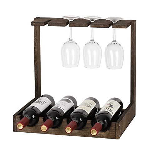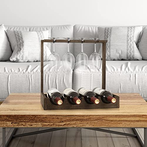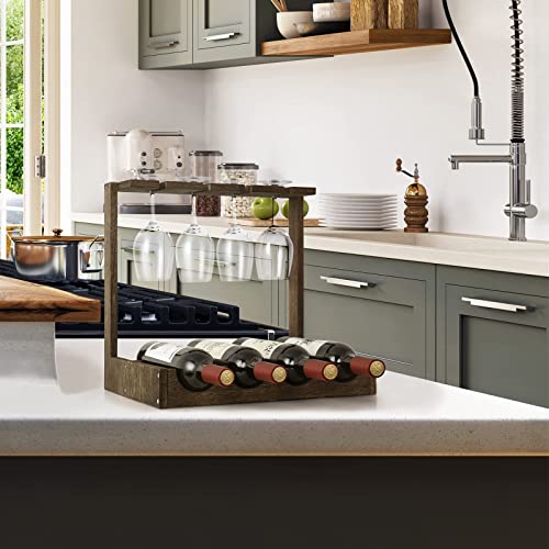 CADUKE - رف تخزين النبيذ مع رف خشبي لسطح الطاولة مع حامل زجاج، خزانة صغيرة لتنظيم المشروبات تتسع لـ4 زجاجات و4 اكواب للبار وقبو النبيذ والمطبخ والمكتب، بني
