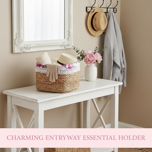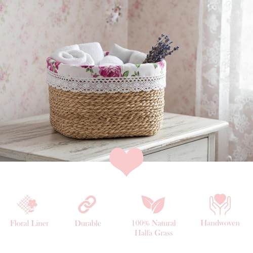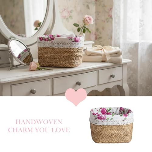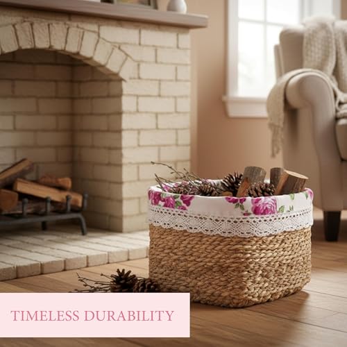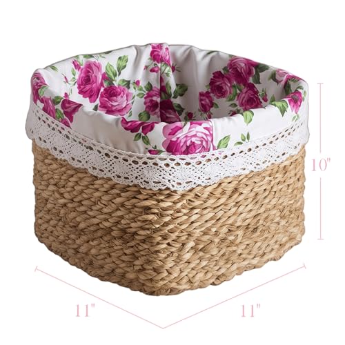 Country charm - سلة خوص مربعة، عشب حلفا مصري منسوج يدويًا، بطانة جبردين زهور ورباط كروشيه قطني، سلة منسوجة مزخرفة، سلة تخزين من الخوص الريفي من كونتري تشارم، كبيرة لارج L (28 × 28 ×25 سم)