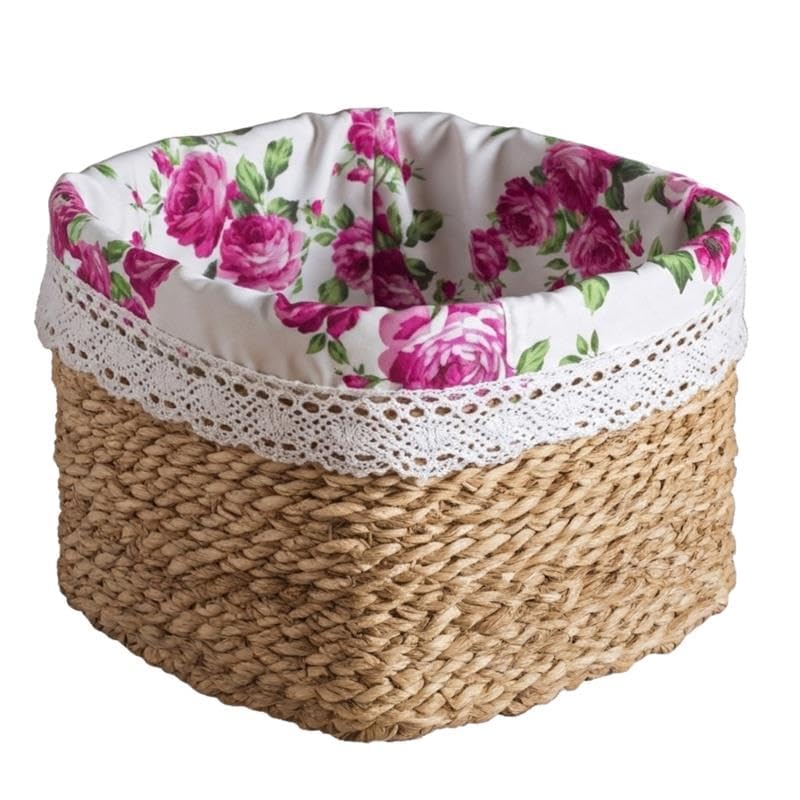 - بطانة أنيقة ولمسة نهائية من الكروشيه الراقي: الجزء الداخلي من السلة مبطن بشكل جميل بنسيج فلور جبردين ناعم، وهو مادة متينة محكمة النسيج ذات ملمس مضلع ناعم يقاوم التجاعيد مع توفير الأناقة والعملية. بفضل حوافها المصنوعة من الدانتيل الكروشيه القطني الطبيعي، فإنها تحول السلال المصنوعة من الخوص أو السلال المنسوجة إلى ديكور أنيق وراقي.