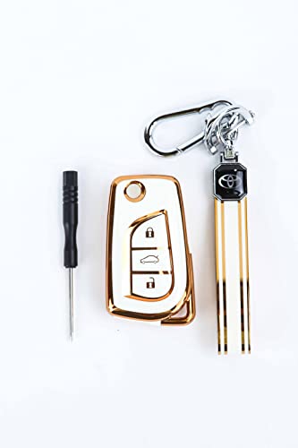 Generic - جراب واقي لمفتاح السيارة بشكل موجة لون ابيض 1 (جلد ابيض×ذهبي) لدخول السيارة بدون مفتاح، غطاء ريموت كنترول سيارة مع علاقة مفاتيح ومفك مجاني للسيارات (تويوتا)