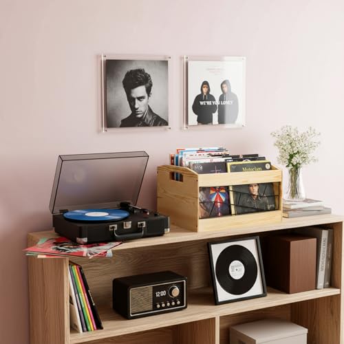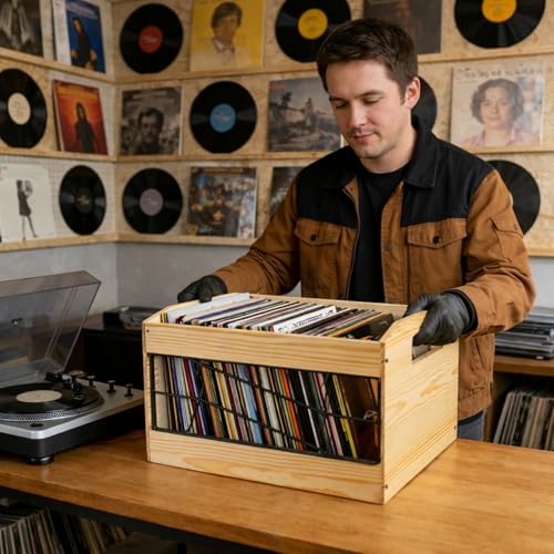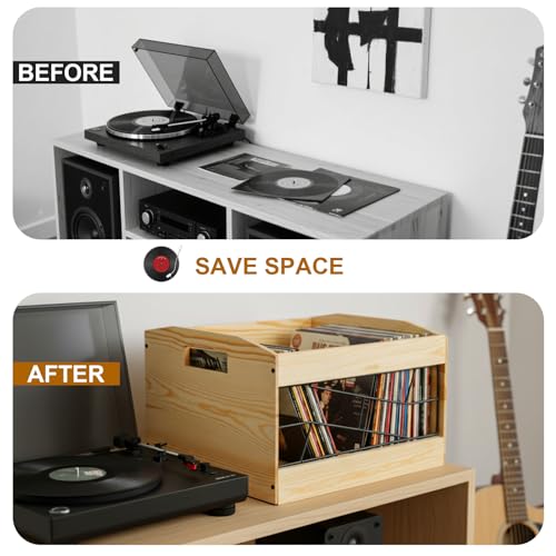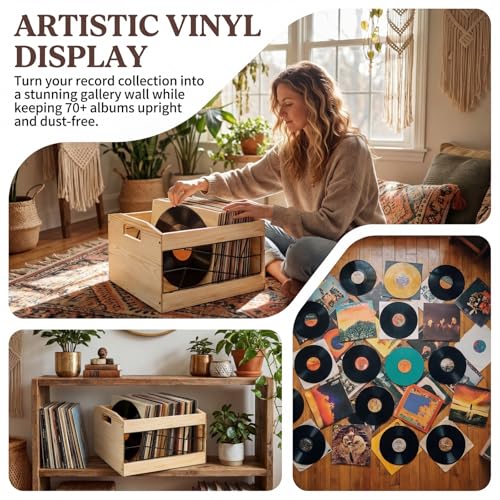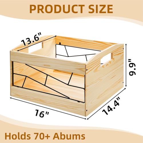 Covzoe - صندوق تخزين أسطوانات الفينيل من كوفزوي، صندوق خشبي مع مقبض، يحمل ما يزيد عن 70 البوم، منظم رفوف البومات CD المكعب الطبيعي، رف منظم الملفات لسطح المكتب والمنزل والمكتب