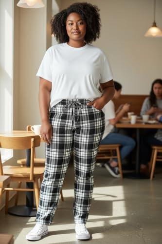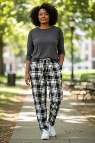 Generic - بنطلون صوف منقوش ومريح للاسترخاء بنمط مربعات بالأبيض والأسود مزود برباط خصر للاسترخاء وملابس النوم، مقاس لارج L