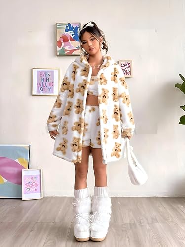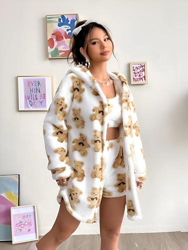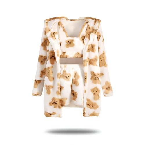 Generic - ملابس نوم مريحة - طقم شتوي انيق من ثلاث قطع مع نسيج صوف منفوش يتميز بطبعات دب، تصميم متعدد الاستخدامات بمقاس واحد للنساء يتراوح وزنه من 55 الى 85 كجم