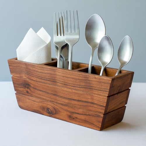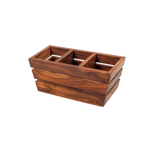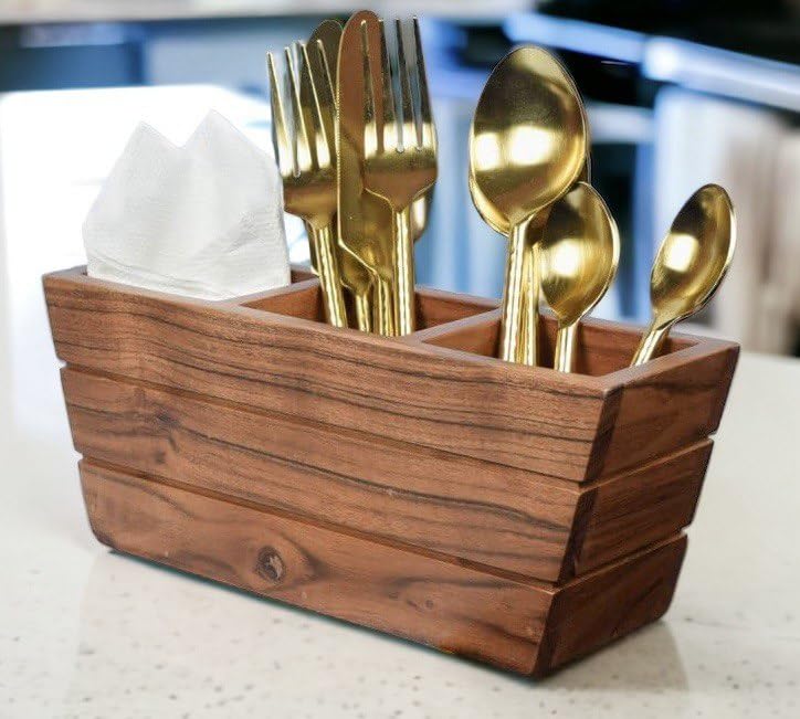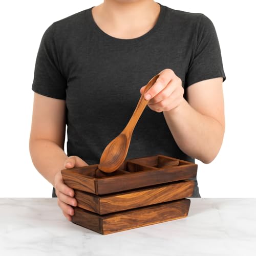 Craft Mshopr - منظم حامل ملاعق خشبي منحني من كرافت مشور - علبة خشبية ريفية للتخزين على سطح المطبخ، مقاس M 9 انش × 4.5 انش × 4 انش، بني